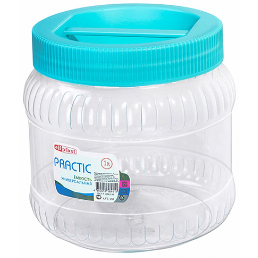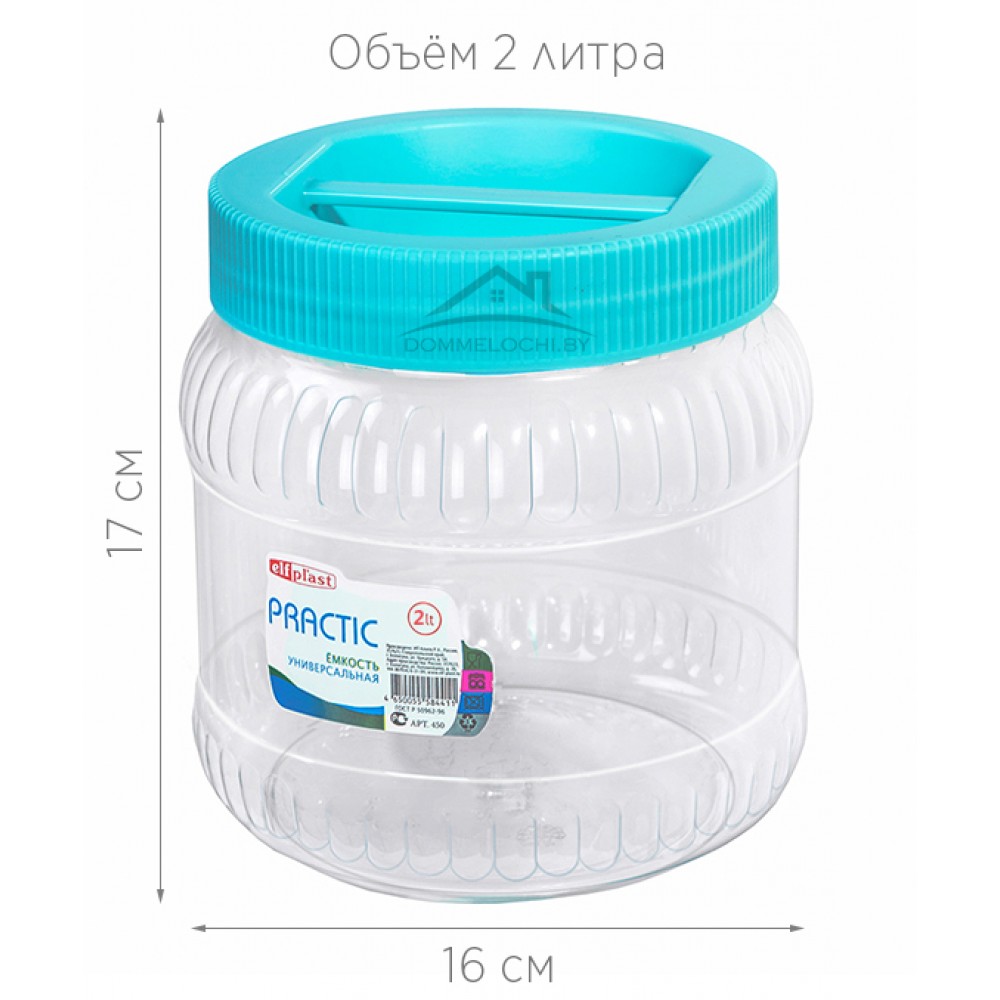 Емкость Practic универсальная 2 л - небольшая пластиковая тара с закручивающейся крышкой. Отлично подойдет для домашнего хозяйства и дачи. Идеальна для хранения как сыпучих, так и жидких продуктов. Выполнена из прочного прозрачного пластика (первичное сырье). Крышка оснащена ручкой для удобной переноски, а также плотно прилегает, за счет чего обеспечивает полную герметичность.