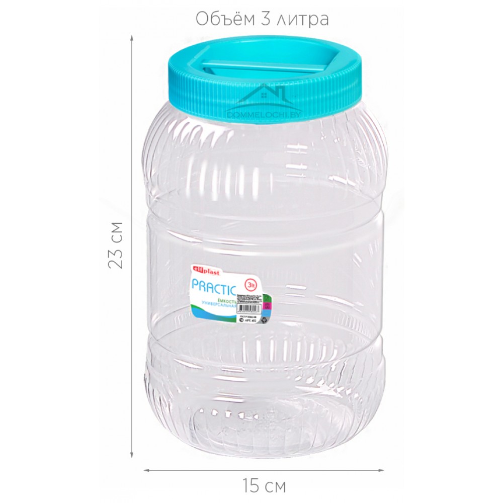 Емкость Practic универсальная 3 л - небольшая пластиковая тара с закручивающейся крышкой. Отлично подойдет для домашнего хозяйства и дачи. Идеальна для хранения как сыпучих, так и жидких продуктов. Выполнена из прочного прозрачного пластика (первичное сырье). Крышка оснащена ручкой для удобной переноски, а также плотно прилегает, за счет чего обеспечивает полную герметичность.