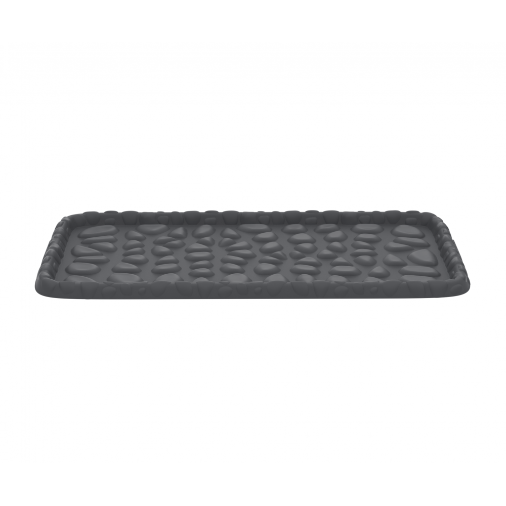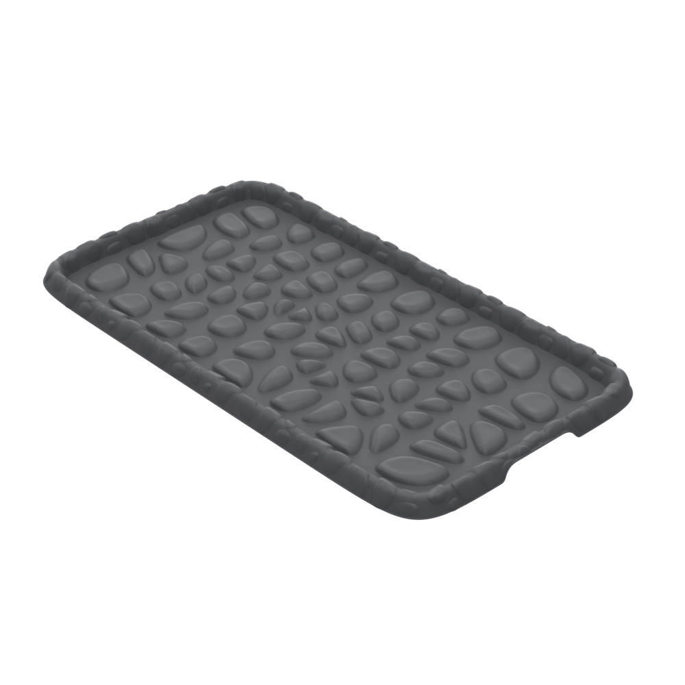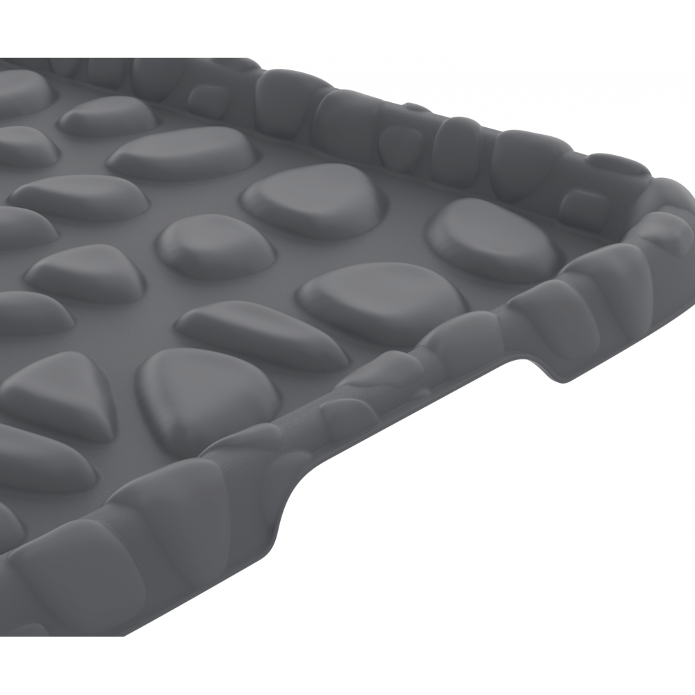 Поверхность лотка похожа на камни. Они приподнимают обувь над лотком, чтобы она оставалась сухой и чистой. Влага и грязь стекут с подошвы обуви на дно лотка. Для удобства перемещения имеются ручки по бокам. Поверхность лотка матовая, его можно легко протереть.