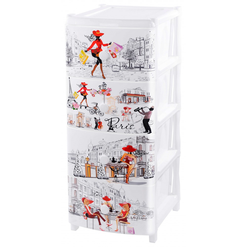 Легкий, светлый рисунок, приятный дизайн пластикового Комод №4 с рисунком Париж отлично впишется в абсолютно любое помещение квартиры или дома и станет неотъемлемой частью интерьера. Четыре глубокие выдвижные ящика, четыре удобные ручки делают комод удобным в использовании. С легкостью организуется пространство и хранение в комнате. Передние панели комода декорированы по технологии IML( вплавляемая этикетка). Абсолютно безопасен, не выделяет вредных веществ. Легко собирается по принципу LEGO.