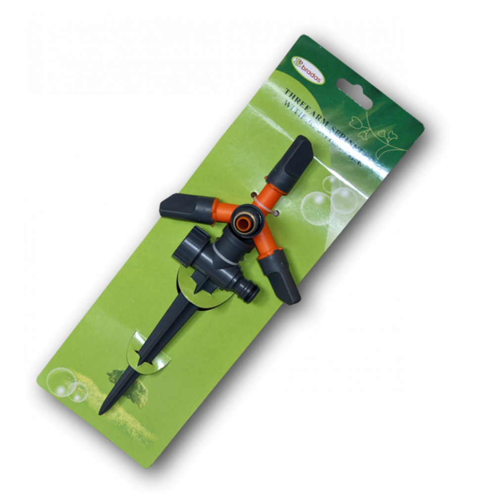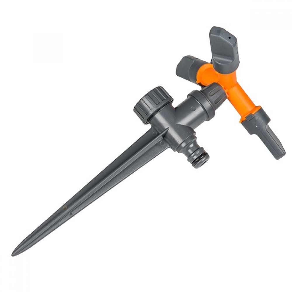 Ороситель вращающийся 3-х рожковый, на колышке. Обеспечивает качественный полив большого дачного участка либо газона. Может использоваться с различными системами полива. Современный ороситель изготовлен из материала высокого качества. Устойчив к прямым солнечным лучам, влаге и другим негативным факторам окружающей среды. Имеет три вращающихся рожка, через которые подается вода для полива. Внутренняя резьба устанавливается на шланг либо трубу с внешней резьбой. Для его установки на дачном участке можно использовать колышек, таким образом не нужно держать его в руках, а можно заниматься своими делами, пока происходит самостоятельный полив.