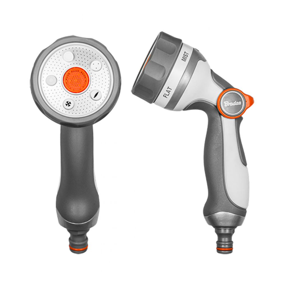 Пистолет Bradas SMOOTH CONTROL WL-EN55M - это универсальное поливочное устройство, благодаря которому можно не только удобно, но и быстро полить огородные, садовые, тепличные и парниковые участки. Данное изделие выполнено из качественных материалов и компонентов, устойчивых к высоким механическим нагрузкам. Обладает устойчивостью к влаге, прямым солнечным лучам и другим негативным факторам окружающей среды. Оросительный пистолет имеет эргономичную рукоятку, которая не только повышает комфорт, но и обеспечивает надежный захват устройства. Данная модель изделия оснащена несколькими полезными режимами: CONE (коническое распыление), JET (мощная сконцентрированная струя), MIST (деликатное мелкодисперсное распыление "туман"), SHOWER ("душ"), CENTER (сконцентрированные струи). Курок-клавиша на рукоятке легко зажимается в крайнем положении для непрерывной подачи воды. Подключение шланга к поливочному пистолету осуществляется с помощью коннектора. Однако, следует отметить, что возможен вариант крепления шланга к пистолету с помощью хомута. Также в данной модели присутствует возможность регулировки силы напора воды.