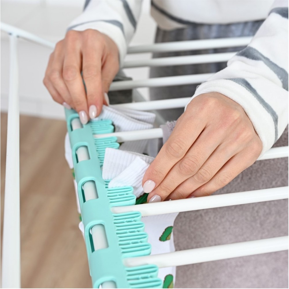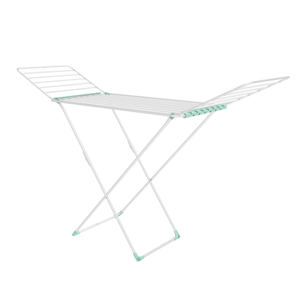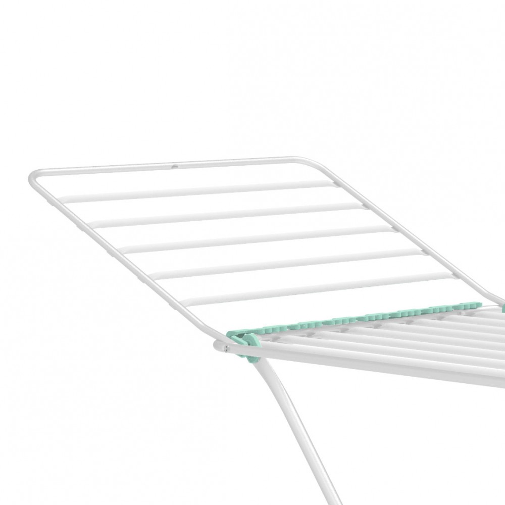 Конструкция с крыльями даёт возможность регулировать необходимый размер сушильной длины, в зависимости от количества вещей. Пластиковые уголки на ножках сберегут Ваш пол от царапин.