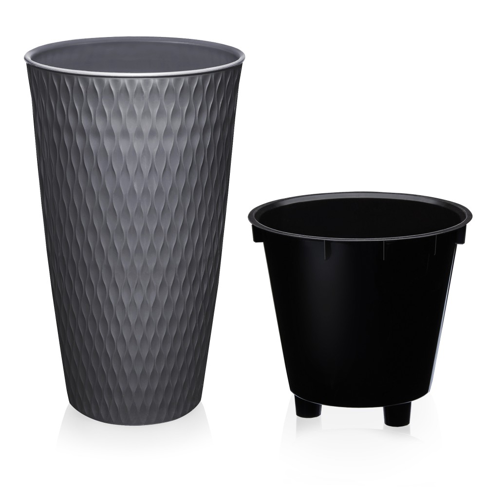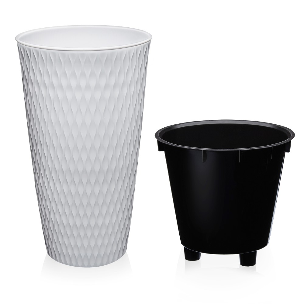 Кашпо изготовлено из высококачественного пластика, который совершенно не токсичен. Материал не выгорает и не растрескивается под воздействием прямых солнечных лучей. Пластик обладает высокой прочностью и стойкостью к механическим повреждениям. Кашпо «Kerama» - это оригинальное решение, сочетающее декоративные свойства кашпо и функции цветочного горшка. Внешний корпус кашпо выполнен из пластика с оригинальным рельефным рисунком. Внутренняя вставка служит контейнером для корневой системы декоративных растений, имеет дренажные отверстия. Излишки воды стекают в наружный корпус и постепенно поступают к корням в период между поливами.